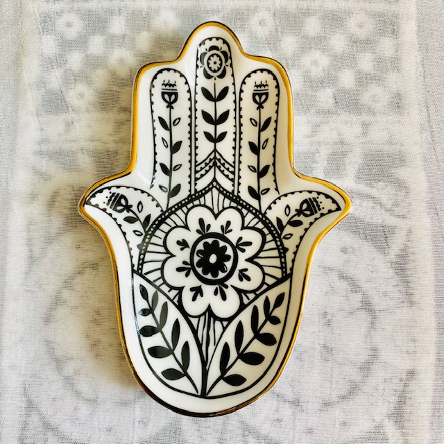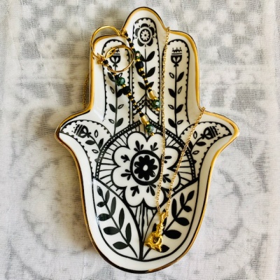 Wunderschöne zarte Keramikschale Hamsa Hand/Fatima und hat eine Grösse von 11,5 x ca. 8cm gemessen. Die Hamsa Hand ist aus Keramik und ein schönes Geschenk für Geburtstage, Weihnachten oder sonstige Anlässe. Die beigelegten Schmuckstücke als Dekoobjekte sind nicht Bestandteil und können bei hokahey-design im Shop gekauft werden.
