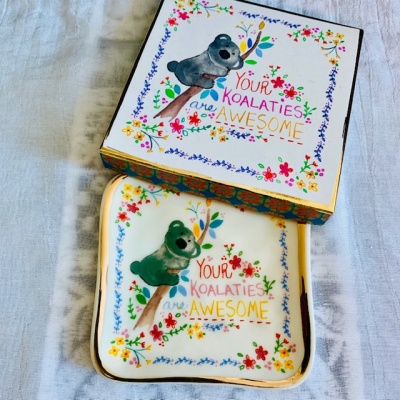 This cute and whimsical ceramic dish has a fun play on words, reading: YOUR KOALATIES ARE AWESOME, and a koala bear is looking up from a tree branch. There are pretty flowers and a gold foil trim around the border. It comes in a keepsake box with the same sentiment. Made by Natural Life, this measures 3.5 inches by 3.5 inches and 0.5 inches tall.